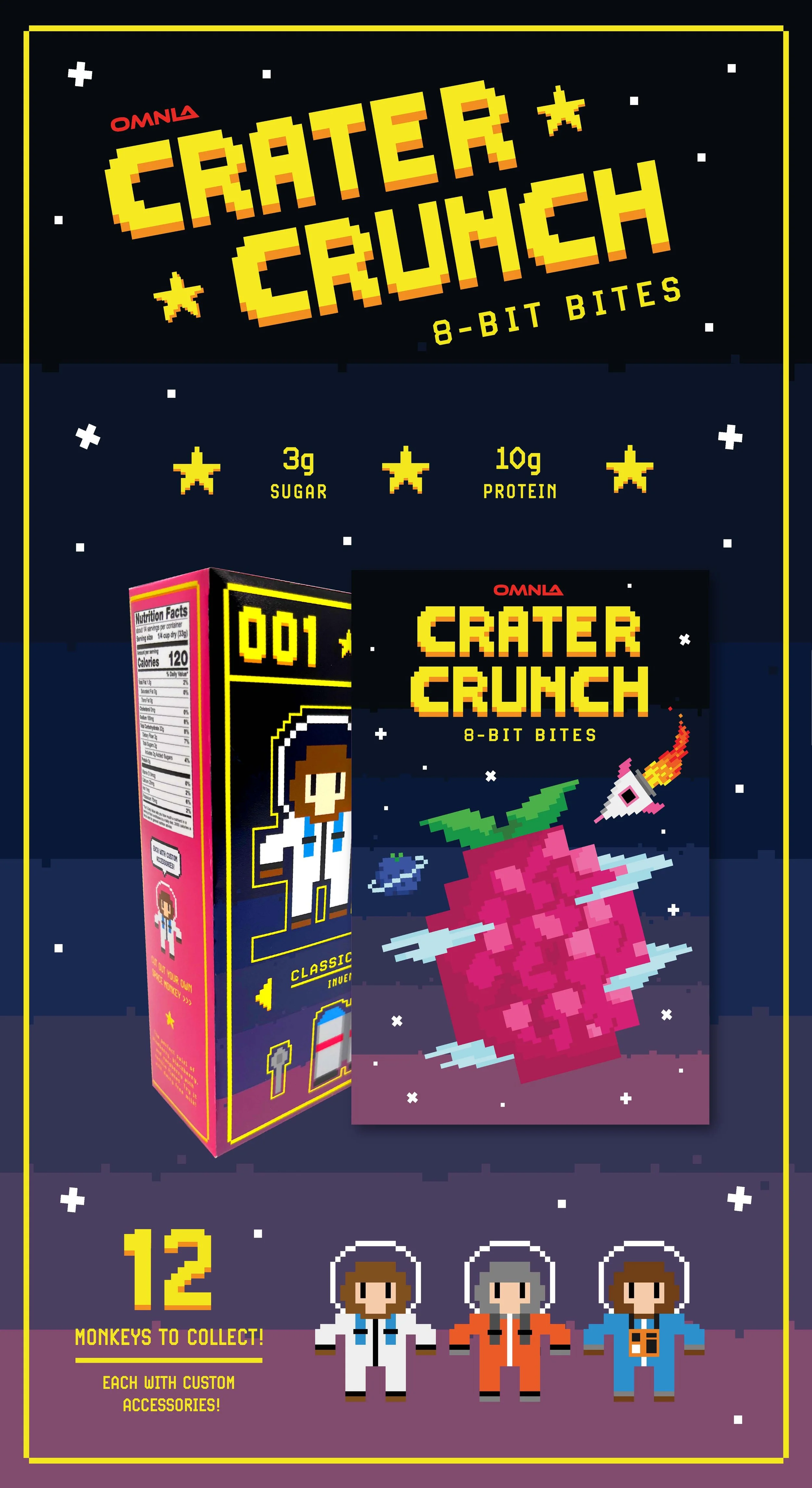 Crater Crunch pays homage geek culture from the 80s and ’90s, inspired pixel art in retro video games and trading cards. Try collecting all the monkeys featured on the back of the box, each with custom accessories.